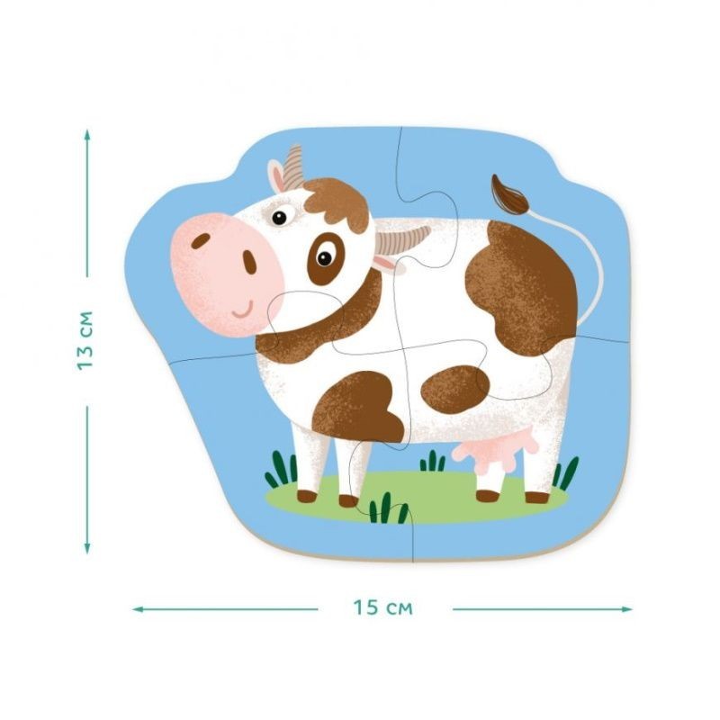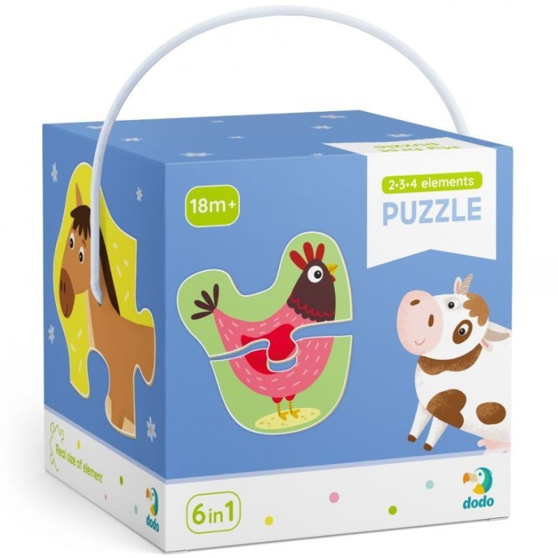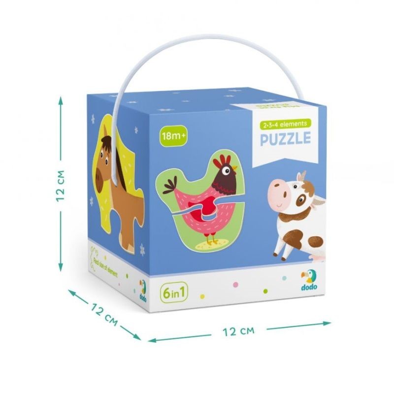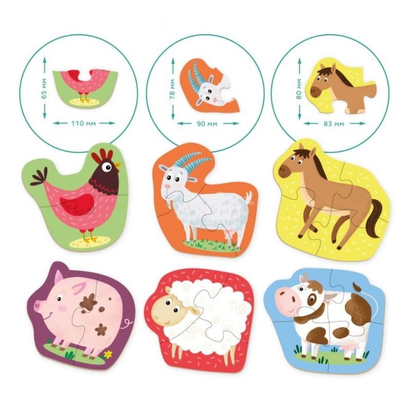 Rinkinyje rasite 6 ūkio gyvūnų dėliones vaikams, sudarytas iš 2, 3 ir 4 detalių. Tai puikios pirmosios dėlionės mažyliams, padedančios žaismingai pažinti ūkio gyvūnus.
