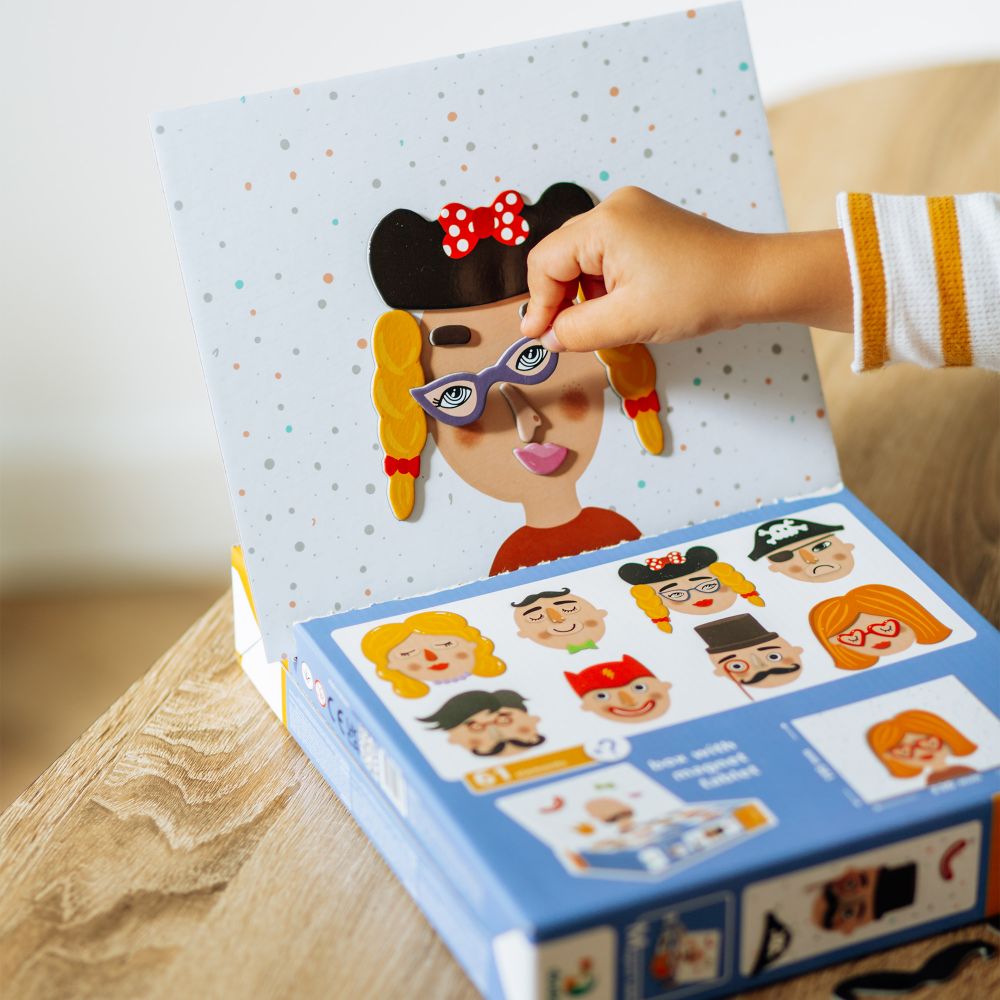 Rinkinyje yra magnetinė lenta (23 × 19,5 cm) ir net 61 magnetinė detalė: skirtingos šukuosenos, akys, akiniai, burnos ir kiti veido elementai. Maišydami detales vaikai gali sukurti daugybę skirtingų personažų ir sugalvoti jiems savo istorijas.
