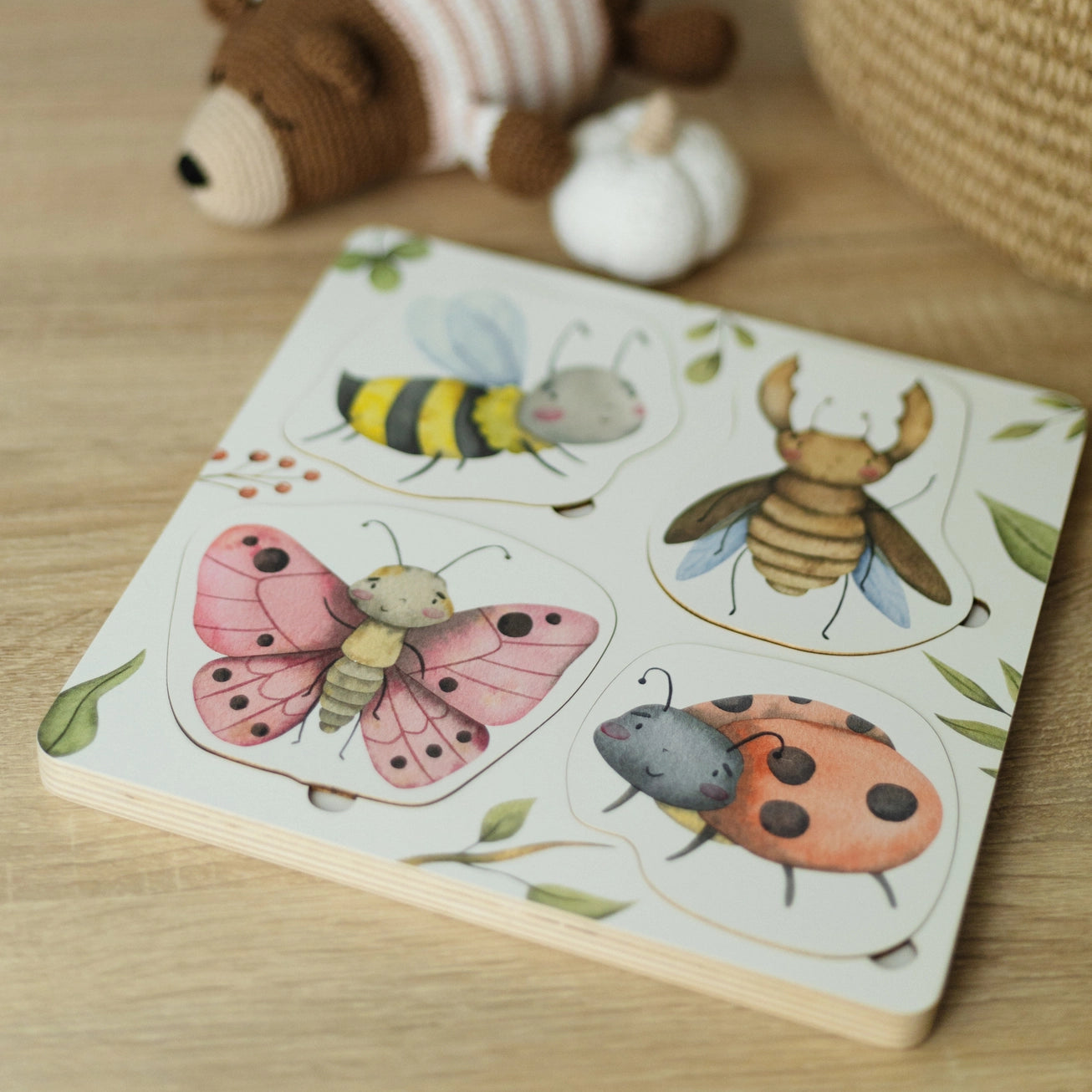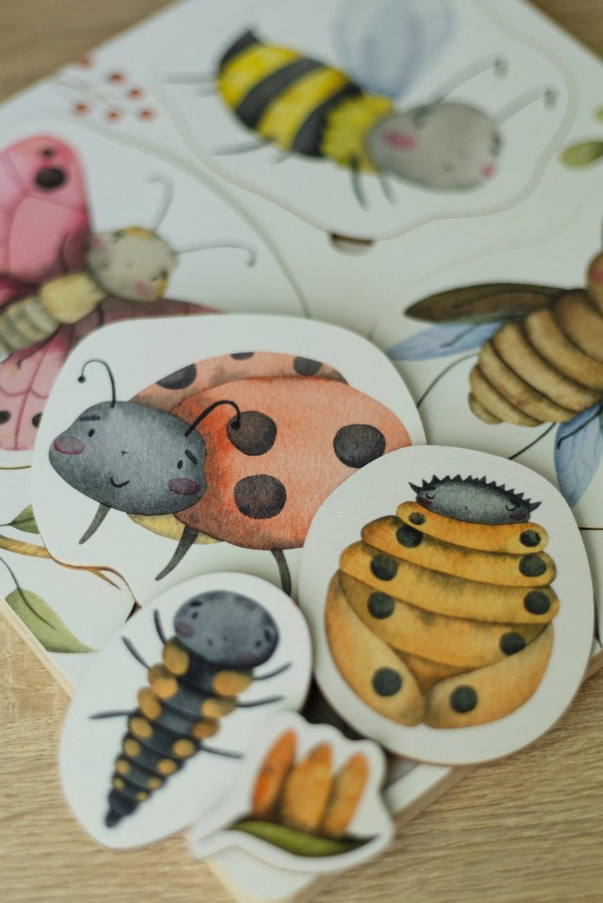 Vabzdžių gyvenimo ciklo dėlionė padės vaikui susipažinti su skirtingais vabzdžių vystymosi etapais ir palyginti, kaip bitės, elniaragiai, boružės ir drugeliai atrodo lervos, lėliukės ir suaugusio vabzdžio stadijose.
