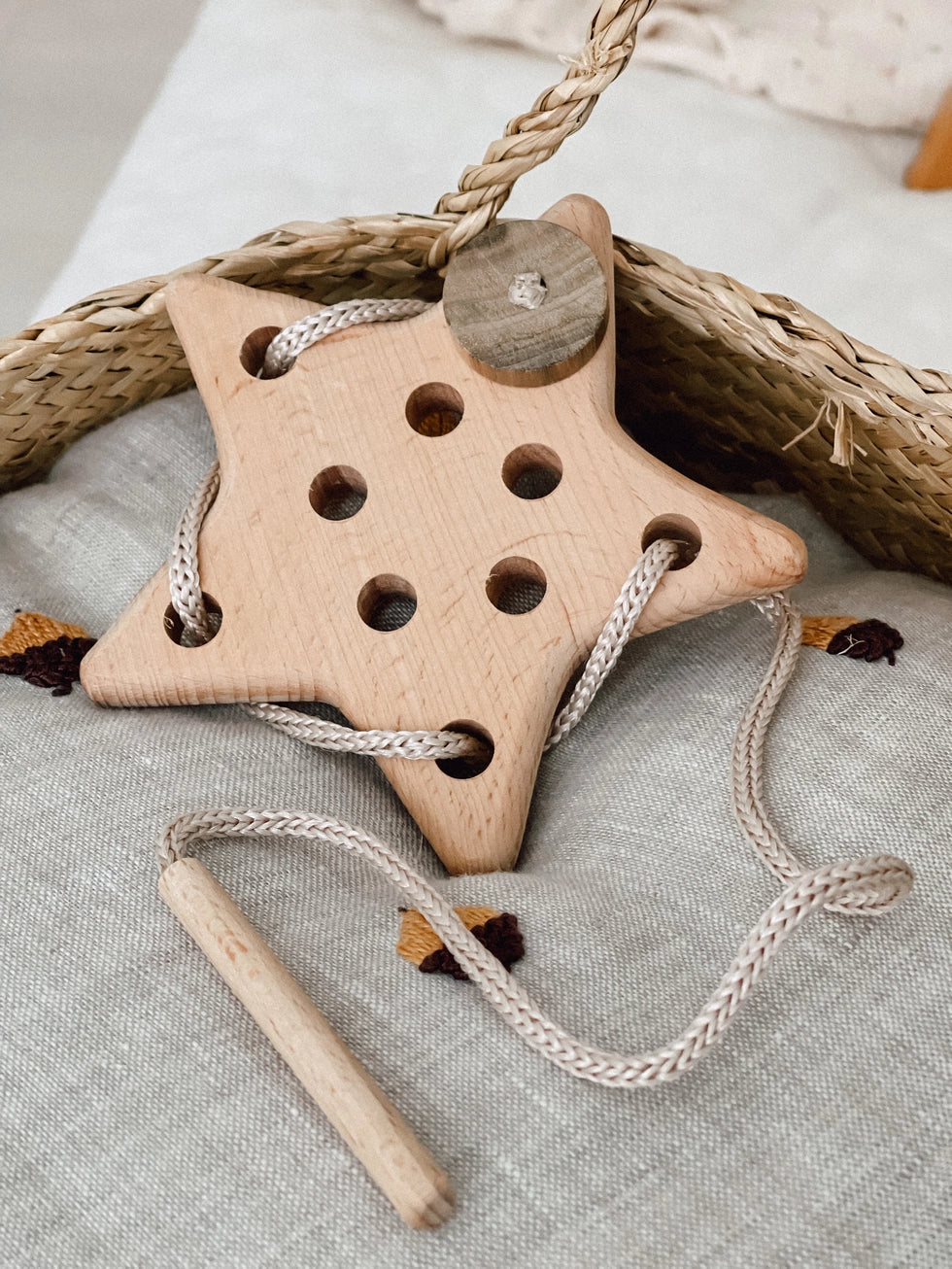 Medinis vėrimo lavinamasis žaislas (žvaigždės formos)