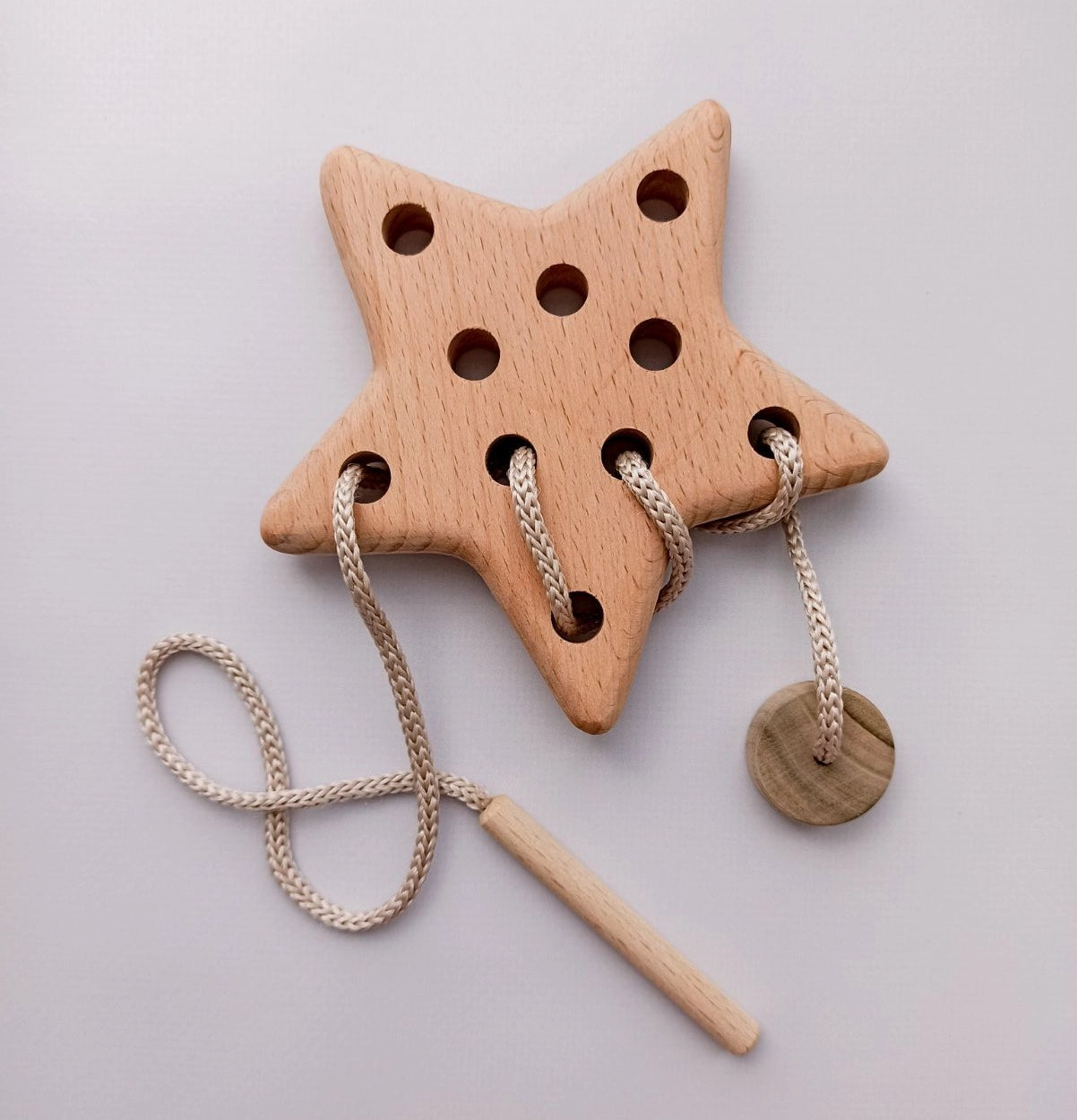 Šis medinis žvaigždės formos vėrimo žaislas – tai ne tik smagus užsiėmimas vaikams, bet ir lavinamasis žaislas, padedantis ugdyti smulkiąją motoriką, akių-rankų koordinaciją ir kantrybę. Žaisdamas vaikas mokosi susikaupti, lavina judesių tikslumą ir paruošia ranką rašymui.