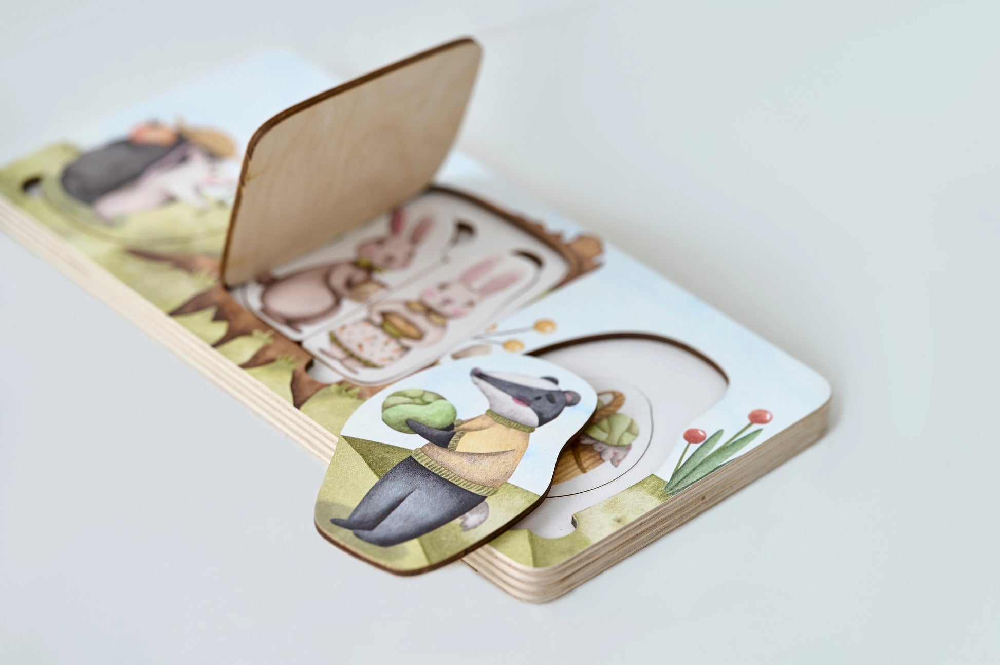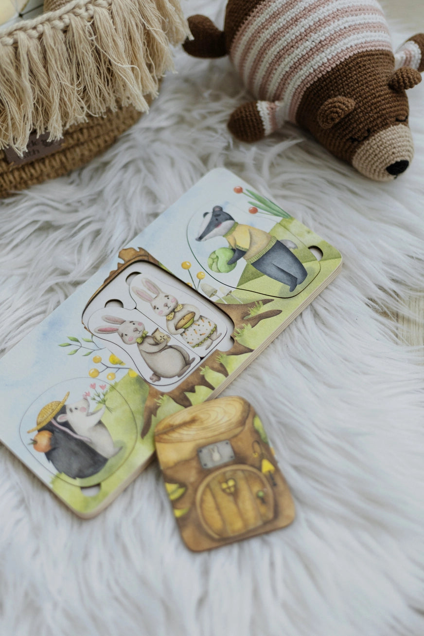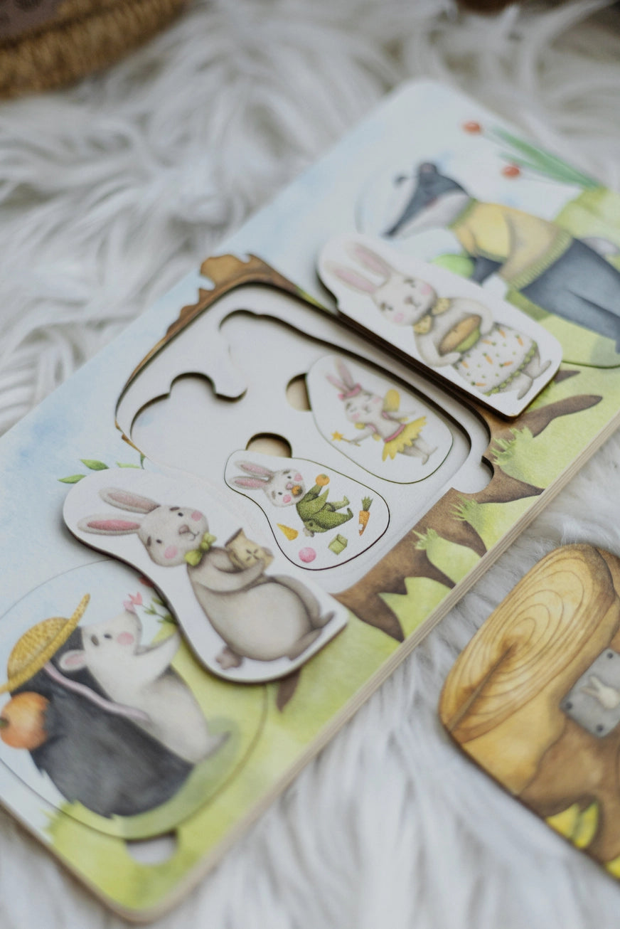 Vaikas turi sudėti elementus vieną ant kito: pirmiausia paveikslėlį su zuikučiais, po to du paveikslėlius su zuikiu tėčiu, mama, zuikučiais ir krepšeliais, o galiausiai elementus su ežiuku, barsuku ir namelio durimis.