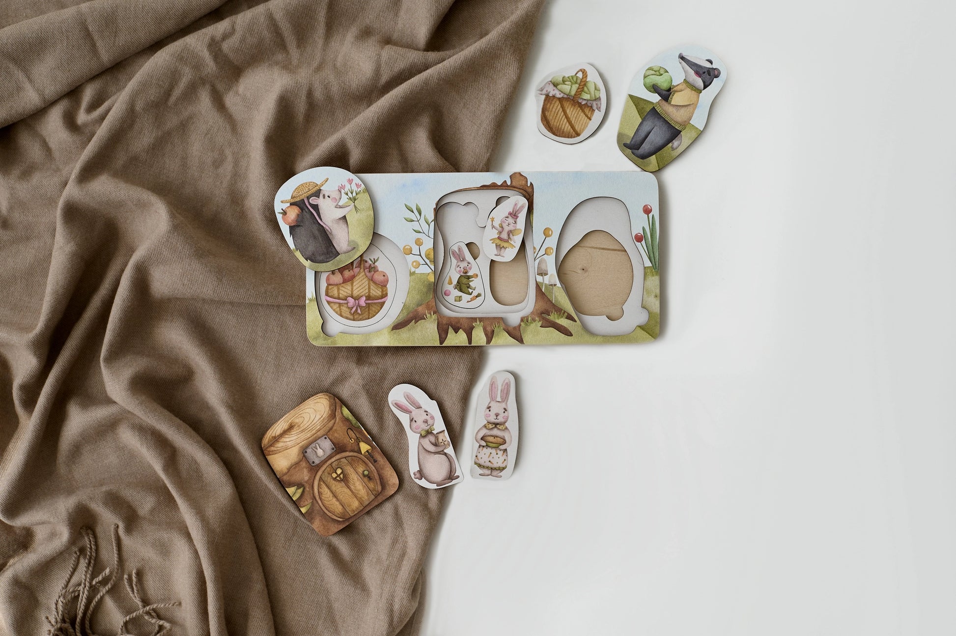 Dėlionė susideda iš medinio rėmelio ir skirtingo dydžio įdėklų. Ant elementų pavaizduoti zuikis tėtis, zuikė mama, du zuikučiai, ežiukas, barsukas, krepšeliai su obuoliais ir kopūstais bei durys į zuikučių namelį.